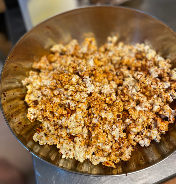 A decadent, yet simple snack....this popcorn takes it up a level.  I think this tastes like the finger coating, spicy cheese puffs that we shouldn't buy... or the bbq shapes we all grew up with...but better. Much better. And quite a bit healthier. And with provenance.